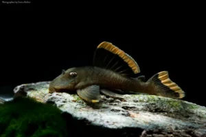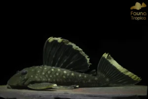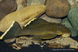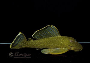 The Magnum pleco is one of the so-called Golden Nuggets from Rio Xingu, Brazil. It has a body with very pale golden spots, but the nice golden seam in its fins is a very nice contrast to the dark, olive-coloured body. It’s not as popular as the spotted Golden Nuggets, but it’s still a very nice fish. It’s of course threatened by the damming of the Rio Xingu, although it’s natural habitat is not only limited to the lower Xingu.